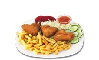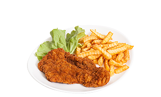 120gȘnițel de pui 120gCartofi prăjiți 150gSalată de varză Chiflă