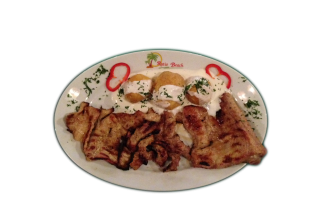 120gCeafă de porc 150gCartofi prăjiți 150gSalată de acrituri Chiflă